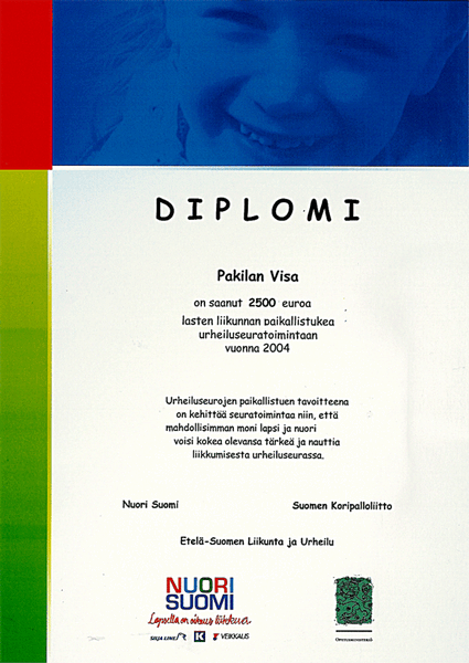 Pakilan Visan koripallojaoston sinettiseurahankkeelle on myönnetty Opetusministeriön ja Nuoren Suomen seuratoiminnan paikallistukea 2500 €. Päätöksessä todetaan, että Pakilan Visa on saanut uutta intoa seuratoiminnan kehittämiseen. Jaoston arvokeskustelun ja toimintaperiaatteiden myötä on syntynyt halu kehittää omaa toimintaansa kohti sinettiä. Paikallistukea myönnettiin tänä vuonna 348 hankkeelle yhteensä 400 000 euroa. Urheiluseuratoiminnan paikallistuen avulla kehitetään seuratoiminnan laatua ja nuorten harrasteurheilua sekä tarjotaan lapsille monipuolisia harrastusmahdollisuuksia.Runsaalle 50 urheiluseuralle myönnettiin paikallistukea, jotta he voivat kehittää toimintaansa Nuori Suomi Sinettiseuraksi. Nuori Suomi edellyttää, että jokaisesta lapsesta pidetään huolta ja että toiminta on monipuolista ja kasvatuksellista. Lisäksi seuroissa tulee yhdessä sopia toiminnan pelisäännöt ja huolehtia ohjaajien säännöllisestä koulutuksesta. Tällä hetkellä Nuori Suomi Sinettiseuroja on 361. Lisätietoja: http://www.nuorisuomi.fi/ajankohtaista?nid=942205 |