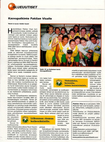 Uusin Korilehti kertoo artikkeleissaan myös Pakilan Visan koripallotoiminnasta. Koko sivun artikkeleissa huomioidaan Pakilan Visan voittaman Kultainen Kori-kilpailun kasvupalkinto. Lisäksi Kori-lehden toimittaja on haastatellut Visan minipoikien mielipiteitä Nuoren Suomen kilpailutoiminnan suosituksista. Lehti ilmestyi juuri ennen joulua ja se toimitetaan kaikille lisenssipelaajille. |
