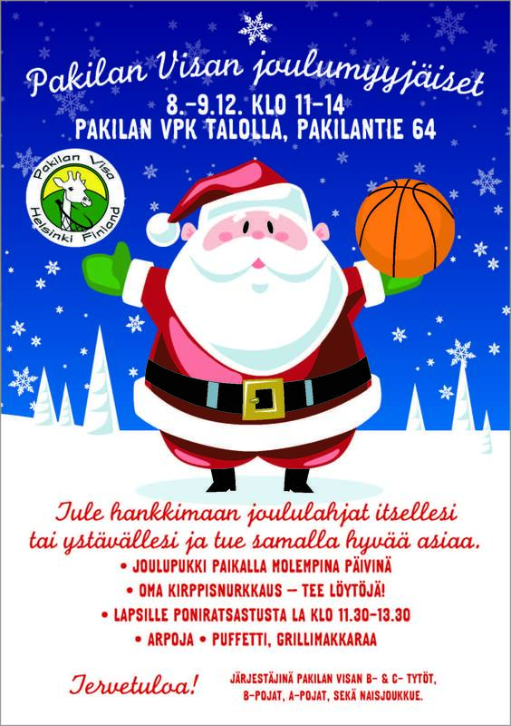 Aina vuoteen 1994 asti olivat Pakilan Visan järjestämät joulumyyjäiset yksi näkyvimmistä perinteistä Pakilassa. Sen jälkeen myyjäistoiminta hiipui kun tilalle tulivat mm. laajat kirpputorit. Pakilan Visan koripallojaosto palautti tuon vanhan perinteen ja järjesti lauantaina 8.12. ja sunnuntaina 9.12. eri joukkueiden voimin perinteiset joulumyyjäiset Pakilan VPK.n talolla. Mukana oli saatu hienosti joukkueita, jotka saivat tuotteillaan houkutelluksi mukavasti ostajia VPK.lle. Houkuttimena oli myös lauantainen poniajelu lapsille sekä todella innokas joulupukki, joka oli toivottamassa tervetulleeksi asiakkaita ostoksille myyjäisiin. |
