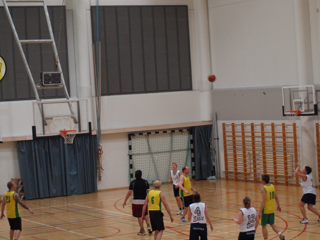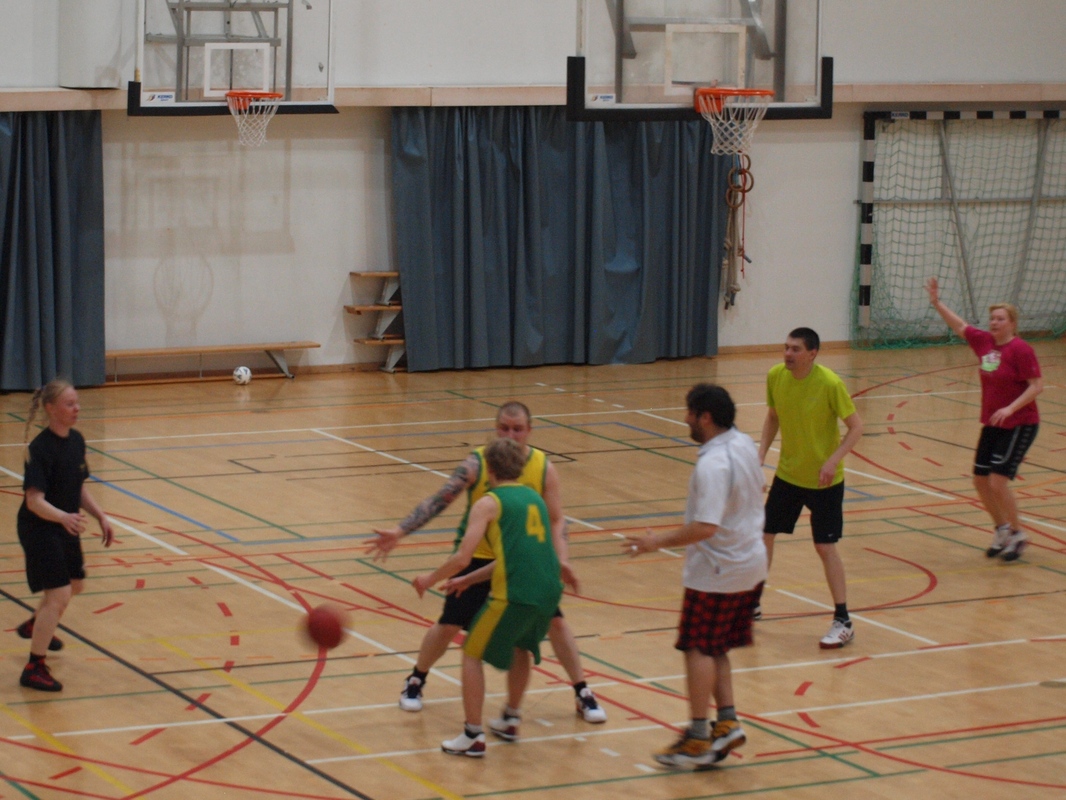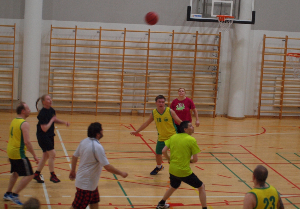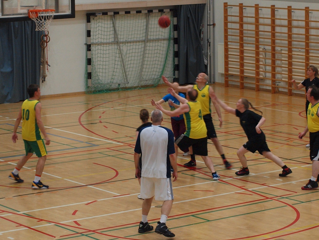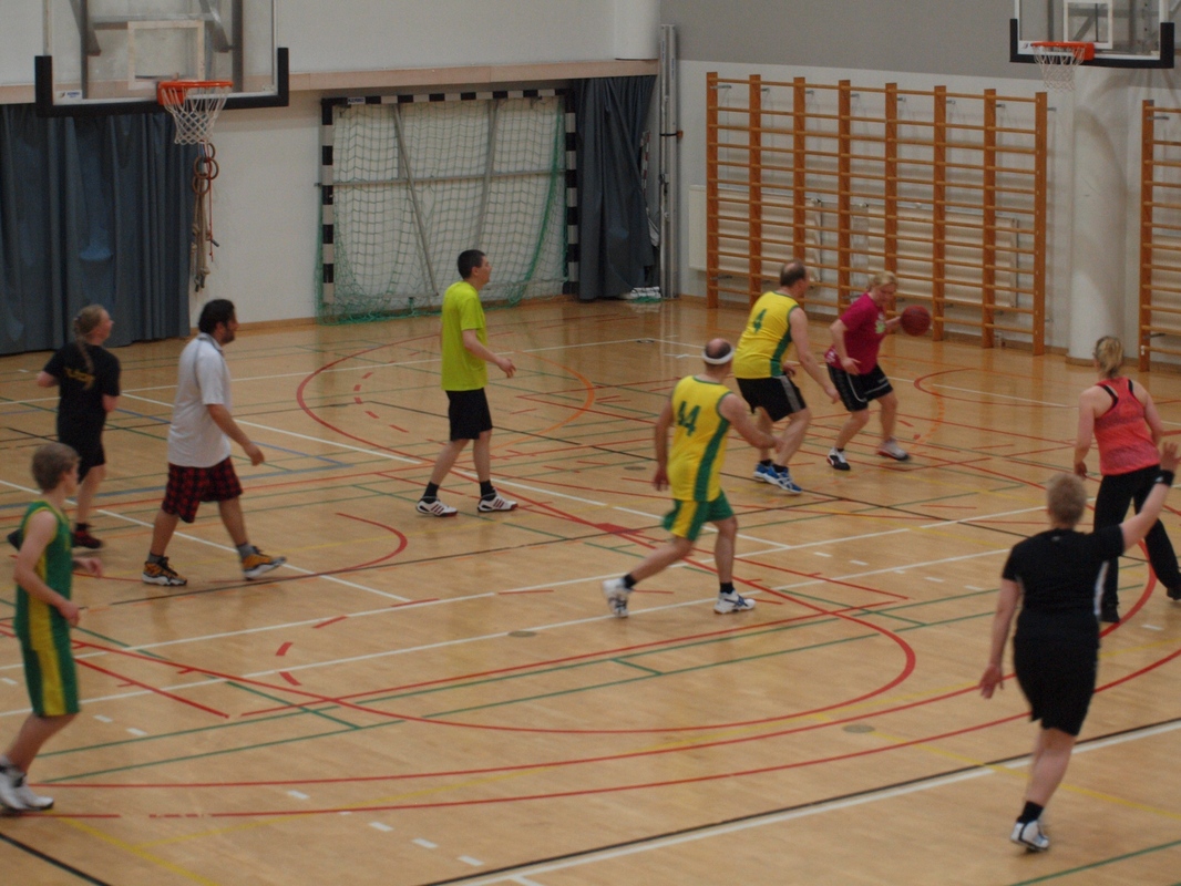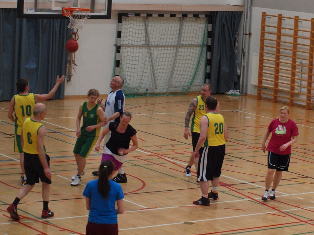 Pakilan Visassa on myös kuntokoristoimintaa, jossa korista harrastetaan lähinnä liikkumisen ilosta. Liikkumisen iloa nähtiinkin sunnuntaina 5.5. Mäkelänrinteen uintikeskuksen palloiluhallissa, kun näitä ryhmiä kokoontui pelaamaan keskinäisiä otteluita. 4x8 minuutin peliaika ja osittain sekajoukkueet saivatkin turnaukseen osallistuneet ryhmät esittämään parastaan. Mukana häärivät pelaajia LosLadies ja Ellien naisjoukkueista sekä Kuntokorisukkojen Kukot ryhmästä. Olipa Vanhojen visalaisten ryhmässä vahvistuksena (vai oliko ne vahvistuksia) muutama A-poika. |