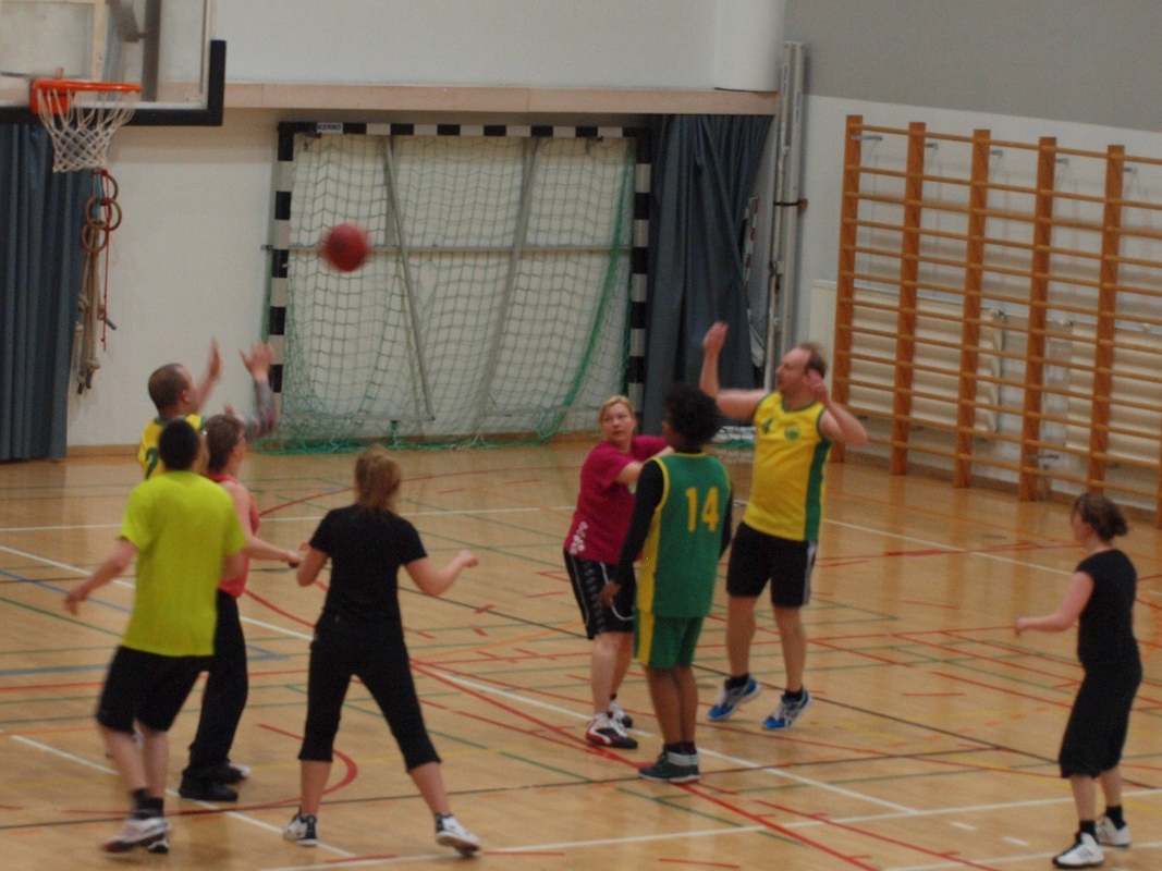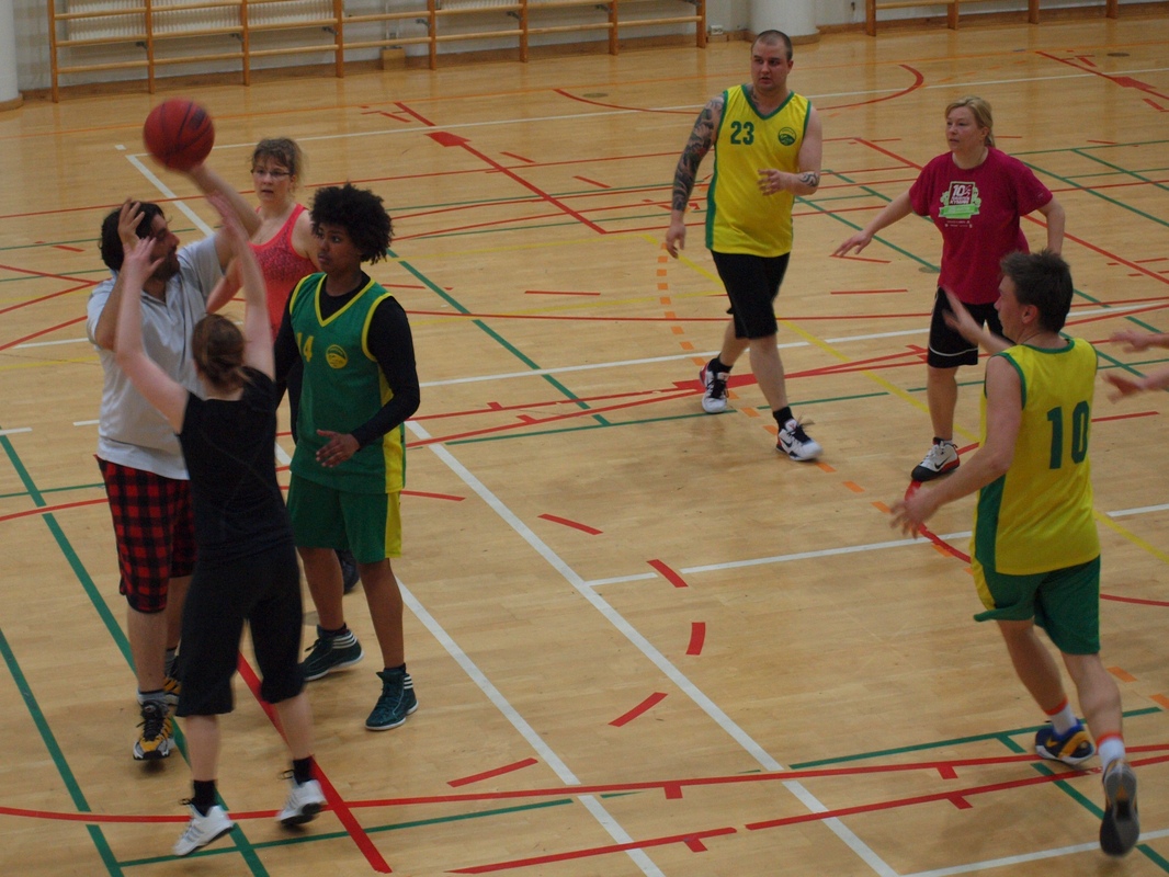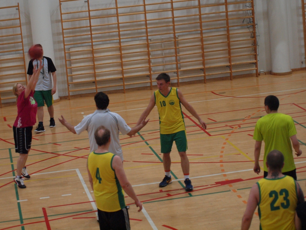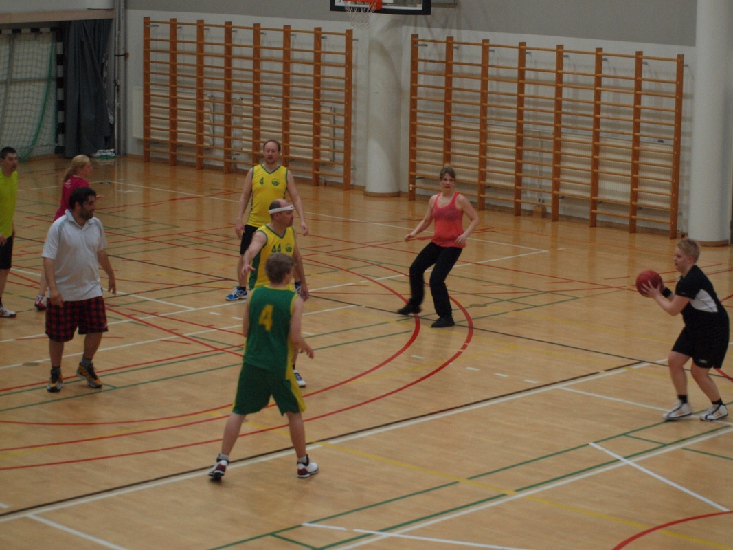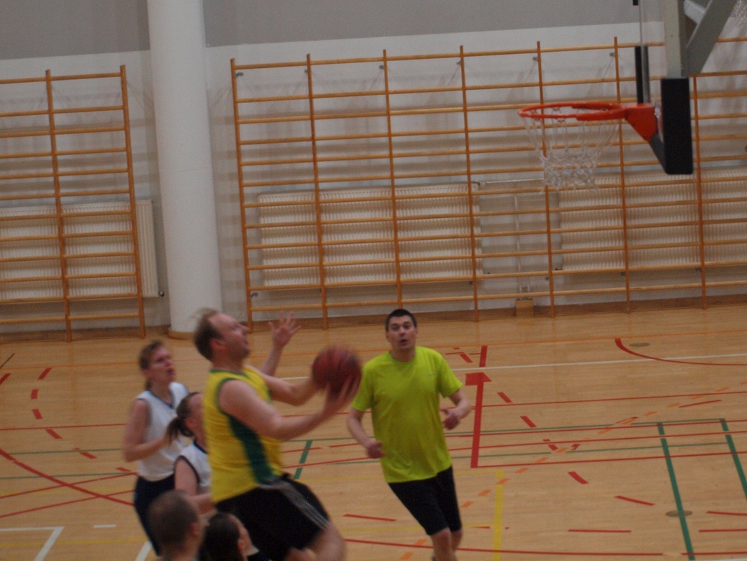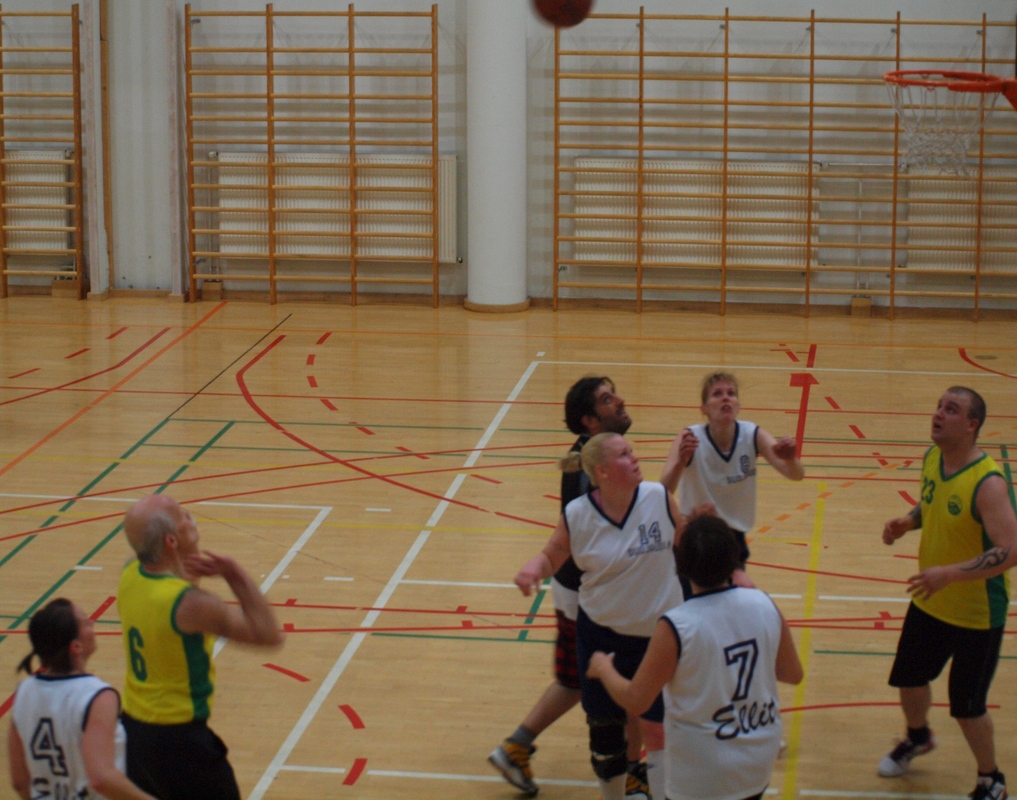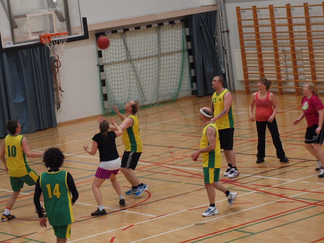 Pakilan Visassa on myös kuntokoristoimintaa, jossa korista harrastetaan lähinnä liikkumisen ilosta. Liikkumisen iloa nähtiinkin sunnuntaina 5.5. Mäkelänrinteen uintikeskuksen palloiluhallissa, kun näitä ryhmiä kokoontui pelaamaan keskinäisiä otteluita. 4x8 minuutin peliaika ja osittain sekajoukkueet saivatkin turnaukseen osallistuneet ryhmät esittämään parastaan. Mukana häärivät pelaajia LosLadies ja Ellien naisjoukkueista sekä Kuntokorisukkojen Kukot ryhmästä. Olipa Vanhojen visalaisten ryhmässä vahvistuksena (vai oliko ne vahvistuksia) muutama A-poika. |
