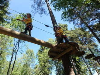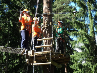 | Onko seikkailupuistojen radoilla turvallista? | Seikkailupuiston radoille meneminen on vapaaehtoista. Seikkailupuisto tarjoaa huikeita itsensä ylittämisen elämyksiä.. Seikkailussa edetään trapetsien, keinujen, kiipeilyseinien, huiman, pitkien liukujen, heiluvien lautasten, halitukkien ja muiden erilaisten vaijeri- ja köysitehtävien avulla puusta toiseen. Seikkailuratoja löytyy lähes kaikenikäisille, -kokoisille ja -tasoisille seikkailijoille. Matalimmat ovat vain muutaman metrin korkeudella, ja huimimmat hyppypaikat ovat 10 m korkeudella. Seikkailijat ovat radalla kiinteässä liukuvassa turvavaljaassa. |
