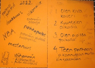 ![]() Joukkueen säännöt ja tavoitteet sovittiin yhteisesti joukkueen illanvietossa | ![]() Allekirjoitustilaisuudessa pojat sitoutuivat sääntöihin ja kaikkien nimi saatii paperiin jonosta ja innosta huolimatta |